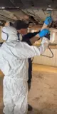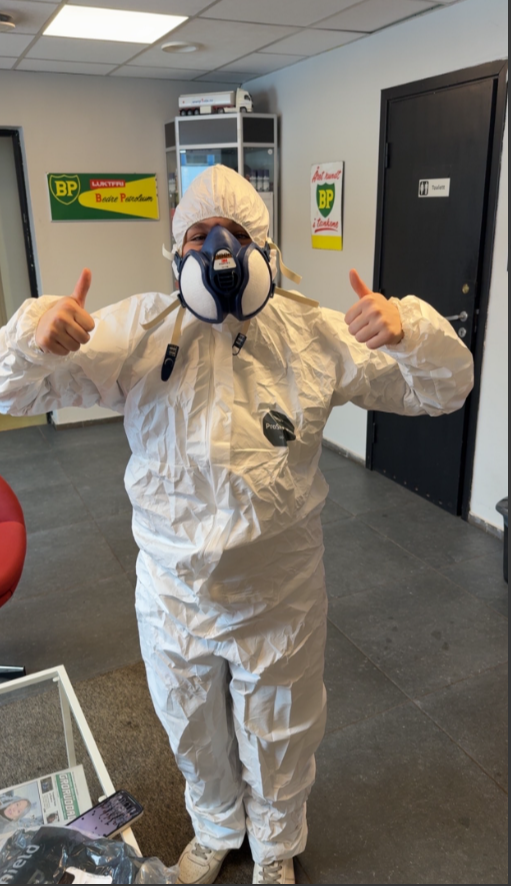 Isabell Rustad bytter ut kjøredressen med en engangsdress når hun skal på sprøytekurs hos Kampen Saga Antirust.