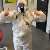 Isabell Rustad bytter ut kjøredressen med en engangsdress når hun skal på sprøytekurs hos Kampen Saga Antirust.